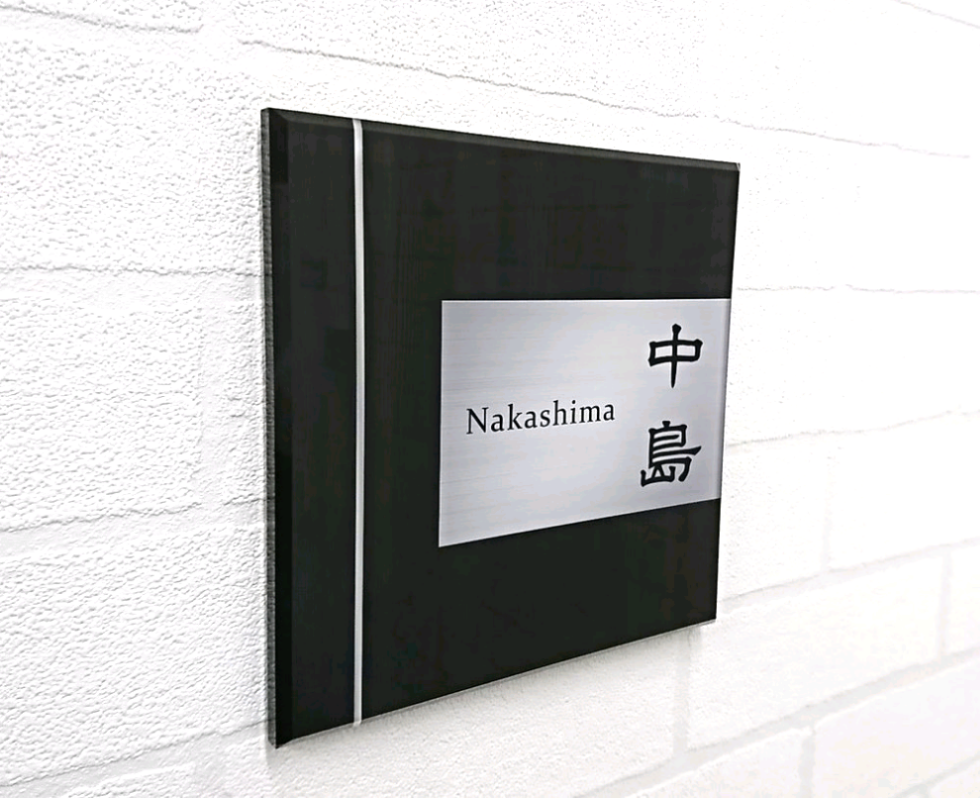 | メーカー | 木目+ステンレスシルバー背景アクリル表札*4辺45度斜めカット鏡面仕上げUV印刷 |