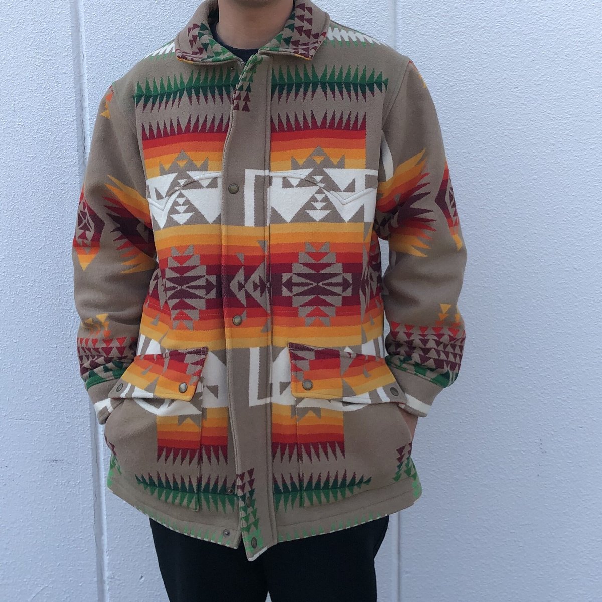 | 商品の特徴 | 70s Pendleton ネイティブ柄ウールジャケットUSA製。70s Pendleton ネイティブ柄ウールジャケットUSA製。80s USA製 PENDLETONペンドルトン ネイティブ柄 ウール ブランケット。#古着屋座古着をまとめておりますので是非覗いてみてください。この柄でXLはまー出てこないです!!!!Special!!!70s Beaver State by Pendleton ウールジャケットUSA製 アメリカ製 made in usaネイティブ柄 TALONzip 短丈コンディション少しジップ開閉がしづらいがしっかり閉めれる後ろ肩に1箇所リペアありsize.....XL着丈.....68.5cm(リブ含む)身幅.....65袖丈……66(リブ含む)肩幅……53。70s Pendleton Jacket Made In USA🇺🇸 Size XL ペンドルトンの | ||